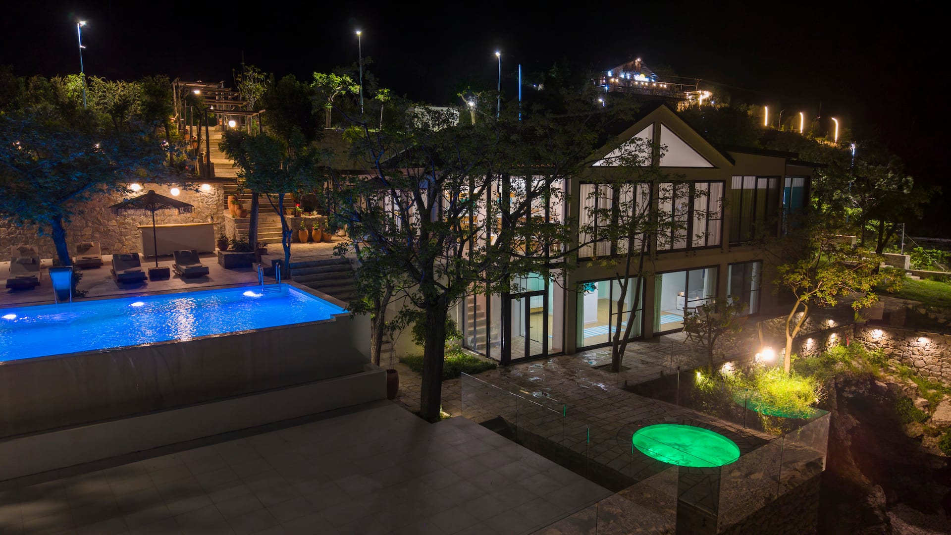A private six-bedroom villa on the water's edge in Zogaj. Pool, jacuzzi, indoor gym, and a quiet garden that opens straight onto Lake Shkodra.